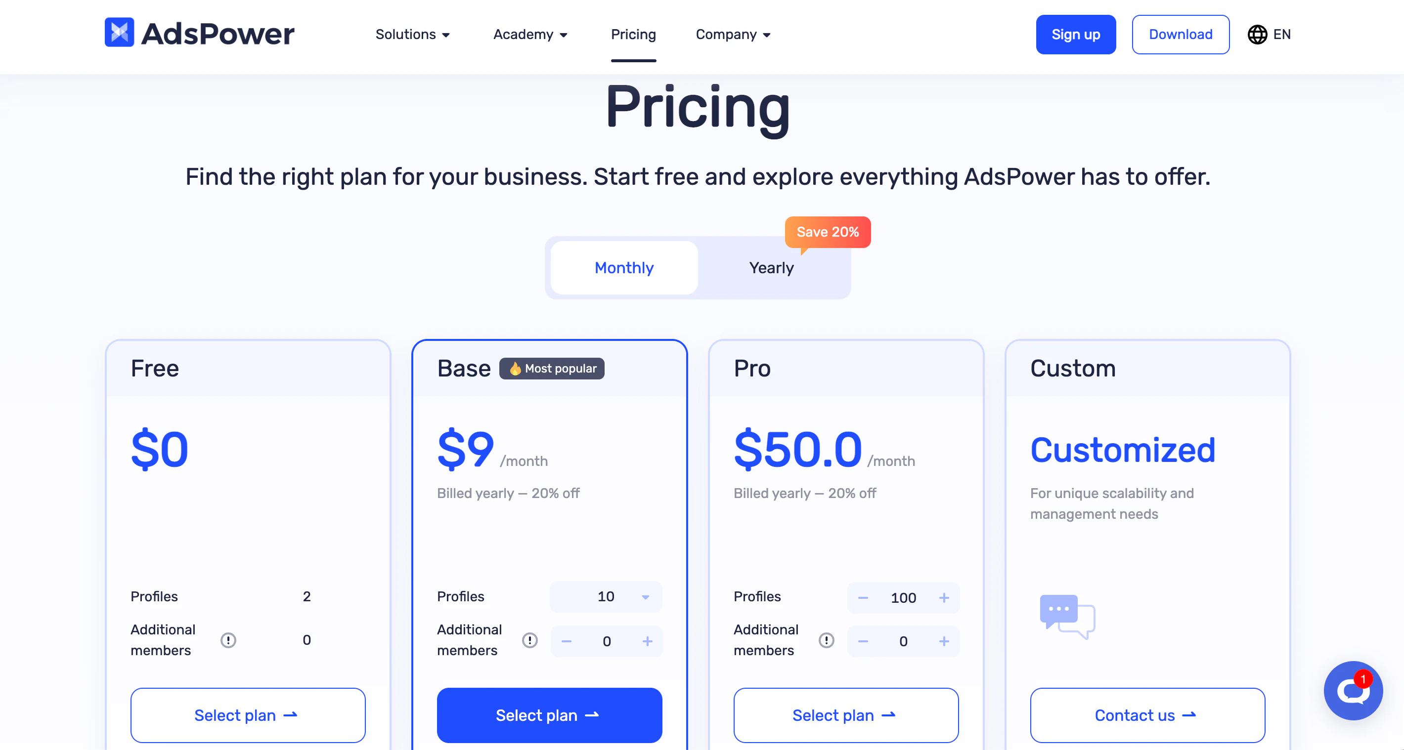 AdsPower 允许您选择自定义数量的团队成员和个人资料,并在最后相应地计算价格。这样,您就不会为不需要的功能支付过高的费用,这使得 AdsPower 成为那些需要灵活功能的人的绝佳选择。